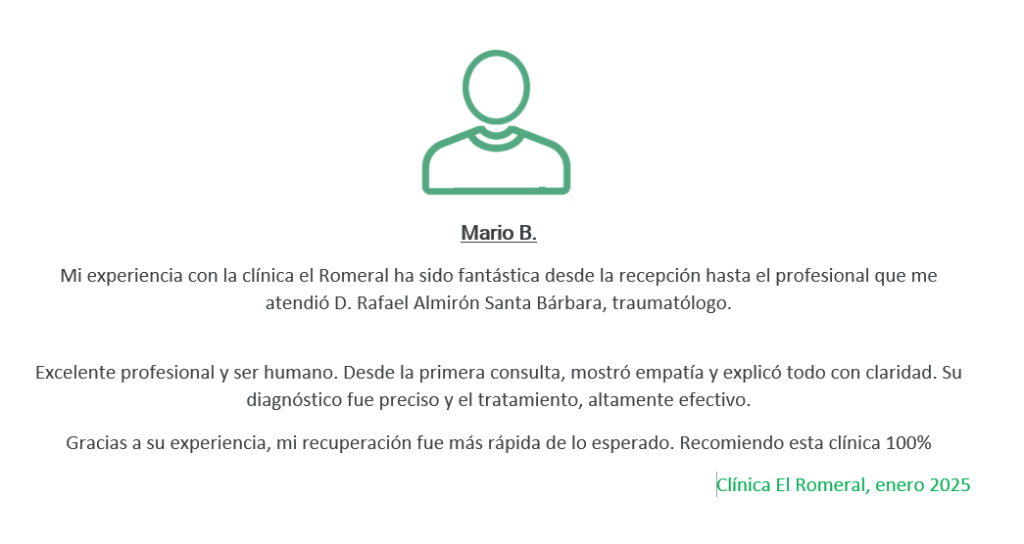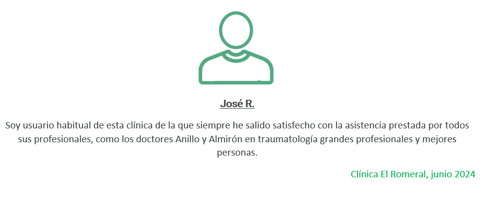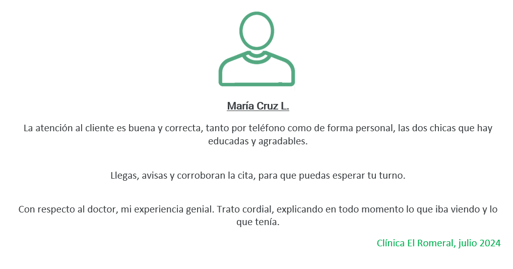 Centro mi actividad profesional privada en Clínica El Romeral para poder dar un trato personalizado, cercano y con todos los servicios disponibles, optimizando las esperas en una sanidad cada vez más desbordada, tanto en el ámbito público como privado